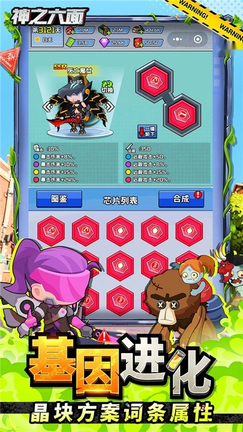 2、玩法也是非常简单的,玩家需要通过召集伙伴,然后通过升级角色、装备和进化基因等方式强化人物战斗力,这样就能对抗各种强大的僵尸,很多的战斗内容都能体验,过程十分耐玩。