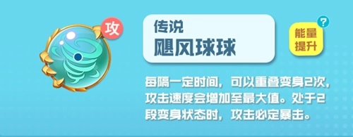 飓风球球(攻):每隔一段时间,可以重叠变身共2次攻击速度会增加至最大值,处于2阶段变身状态时,攻击生效为暴击