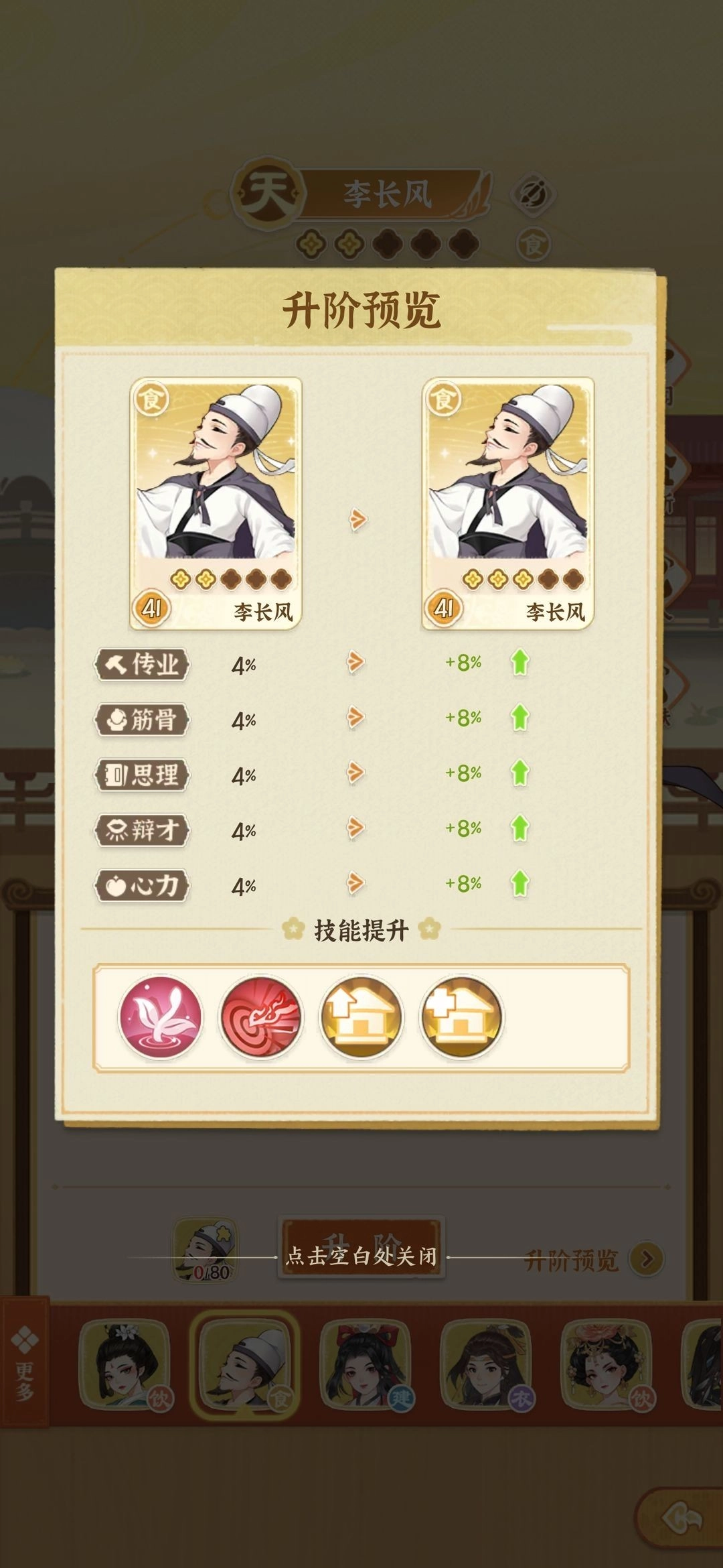 名士技能:主技能、特殊技能、全局技能(以李长风举例)(升星加成请游戏中查看,每个名士升星加成百分比一样)