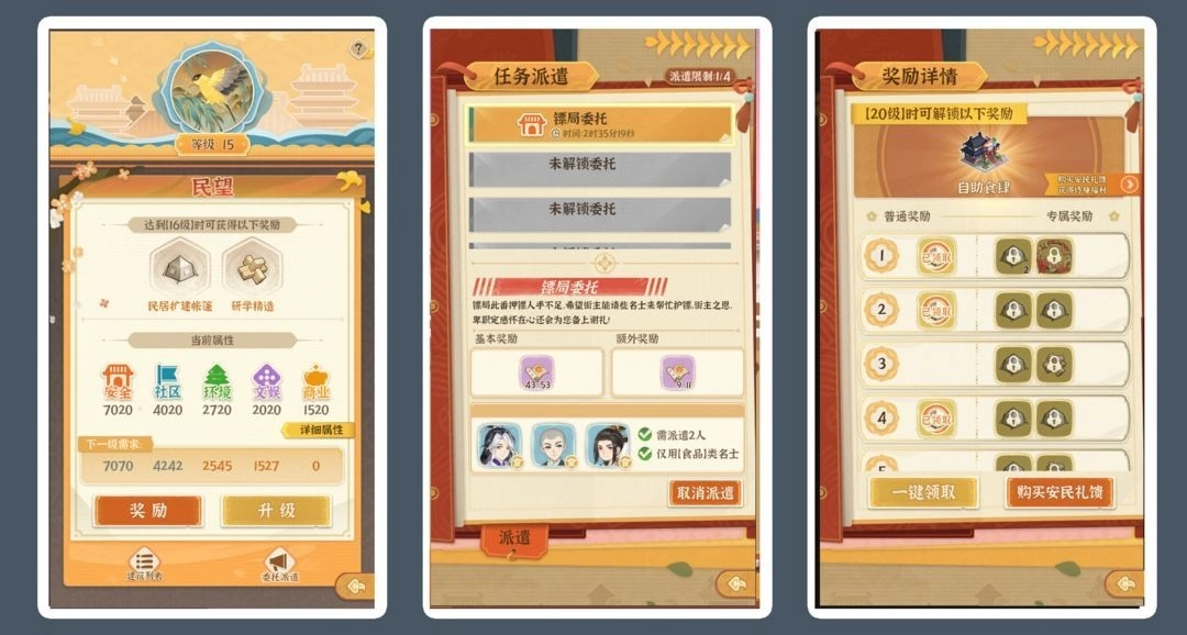 当五个属性(安全、社区、环境、文娱、商业)数值达标后,即可提升民望等级获得“升级材料”,属性可以从名士、建造装饰建筑、升级民望建筑等方式获得~