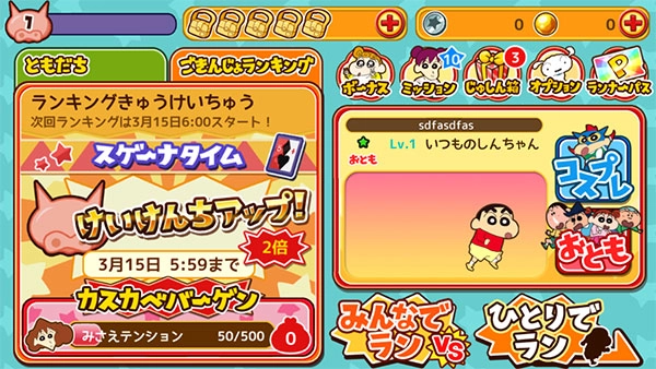 1、以春日部为跑酷的舞台,穿梭在春日部的街道之上,收集更多的巧克力饼干,获得更高的分数吧。