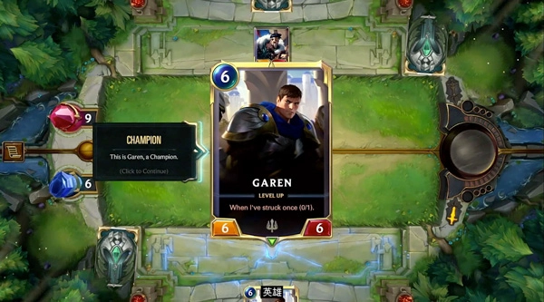 英雄牌可以完成卡牌描述上的任务进行升级。升级后将会获得新的身材和(更加强力的)效果,其衍生牌也将获得新的效果。(盖伦的任务为:打击两次)