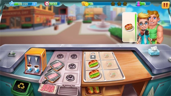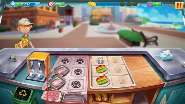 游戏一共有40关,每过一关才能解锁下一轮和升级,每一关系统分配的赚钱目标的收益都会有所递增,以及能否解锁拥有先进的厨房灶具和忠实的顾客等。而厨房升级最为重要,直接影响你店铺的出餐效率。下面小编以美食快餐车为例。
