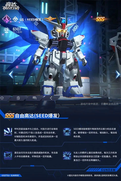 自由高达(SEED爆发)强大的火力打击能力使得该机在面对敌方高耐久单位时造成更高的伤害。同时精准打击能力能够给团队提供稳定的减能控制。