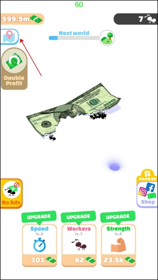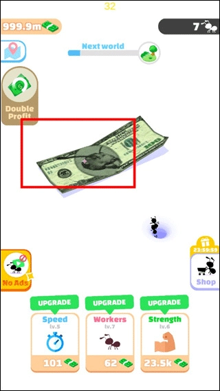 1、首先大家进入小蚁帝国游戏,可以看到蚂蚁需要搬运的物品,也可能是食物,这次小编的是钞票。