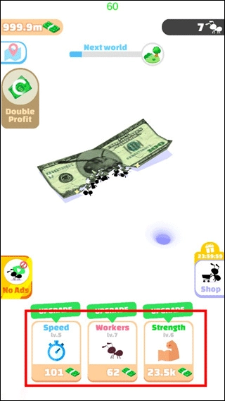 2、随着蚂蚁对食物的拆解搬运,收益逐渐提升,你可以提升蚂蚁的基础属性,让蚂蚁可以更加快速的进行拆解搬运,获取到更多的收益回馈!