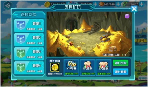 2、点击废弃矿坑,在这里你可以选择副本的难度,难度越高奖励越高