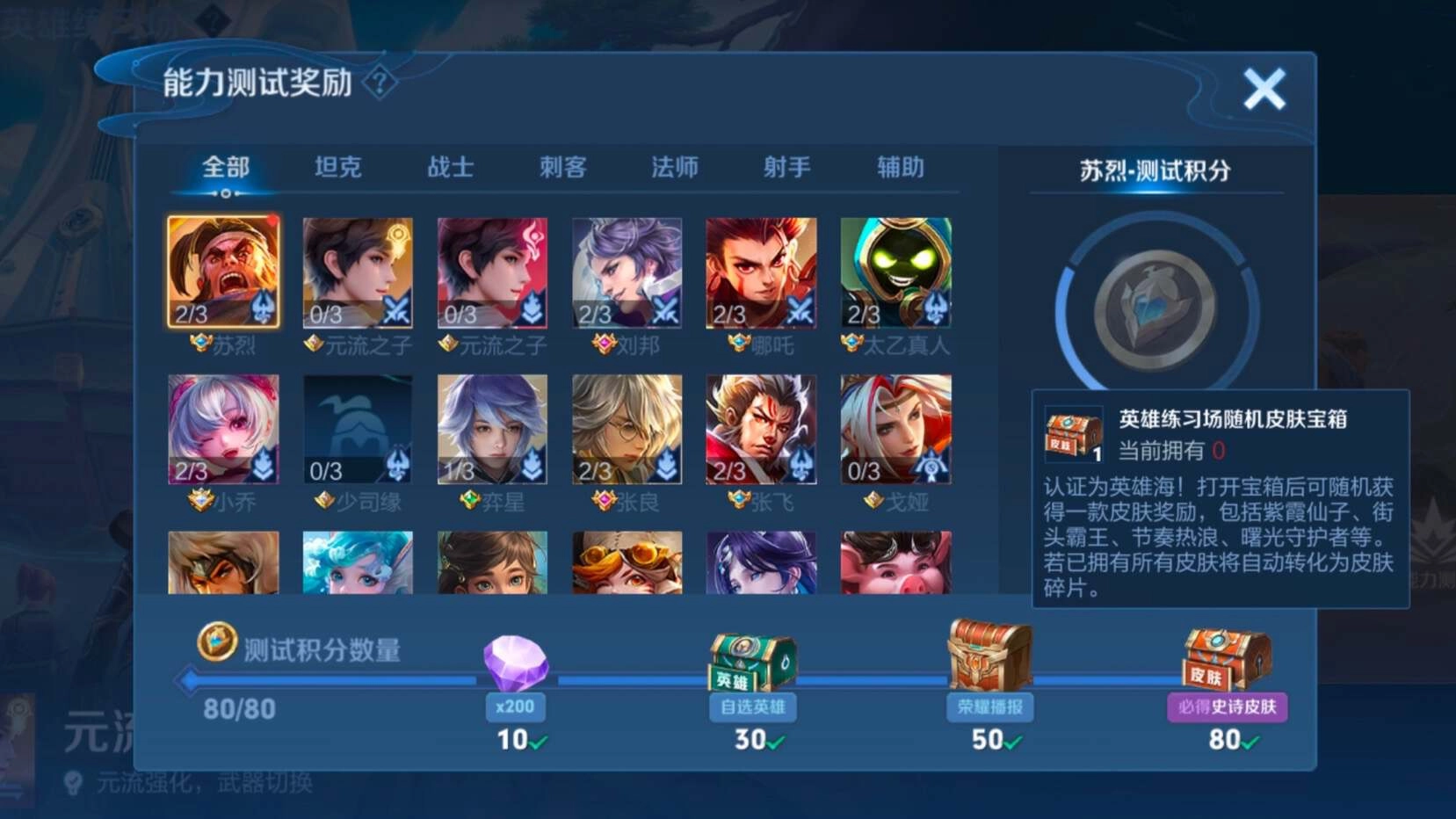 1、英雄修炼在英雄修炼这个地方,可以获得一个随机史诗皮肤宝箱,如下图所示,玩家测试积分达到80分的时候,就可以领取史诗皮肤了。