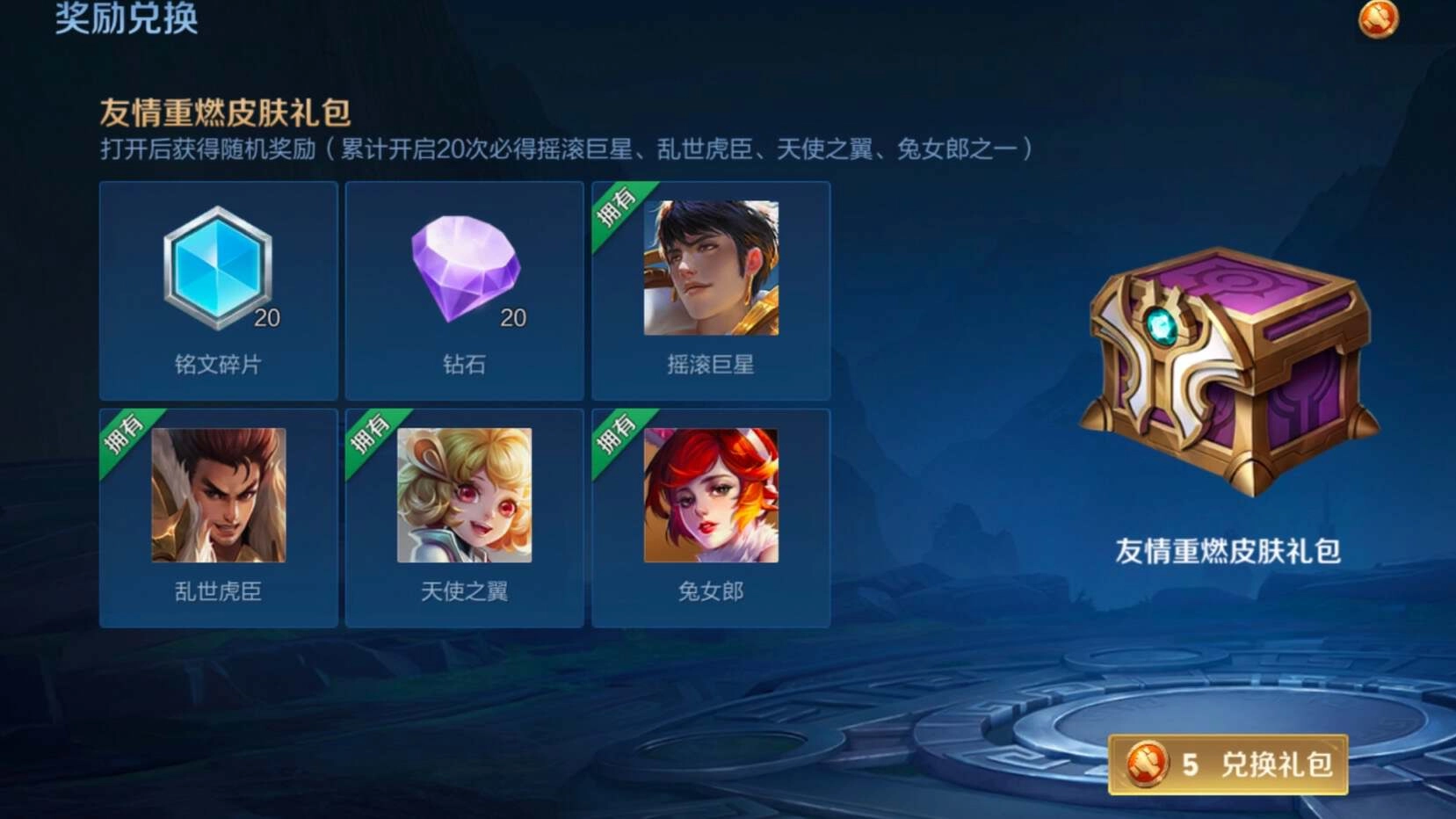 2、老友商店在老友商店也可以拿到免费的皮肤,右上角的好友图标,然后选择友情重燃,在友情商店就可以兑换皮肤礼包了。5个友情币兑换一个卡波,累计开启20币必得一款皮肤,也就是100个友情币就可以获得一款皮肤。