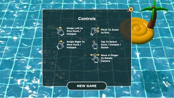 2、按照屏幕上显示策略的操作步骤,控制:向左滑动以预览/热点;向右滑动以下一个鸭子/热点;捏合以放大/缩小;点击选择鸭/热点/嘎嘎;移动手指旋转相机。