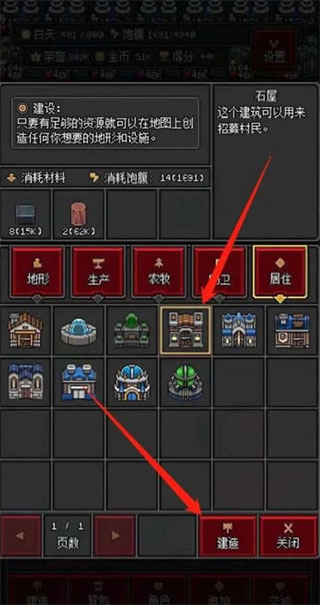 1、第一步,在游戏里修建“石屋”建筑(依据建造界面的提示找到对应的选项),等建造完成后,就能为之后招募商人打下基础。