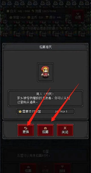 3、在招募界面底部找到 “更换” 按钮并点击,切换可招募 NPC,当出现 “商人” 时,点击 “招募” 将其纳入队伍。
