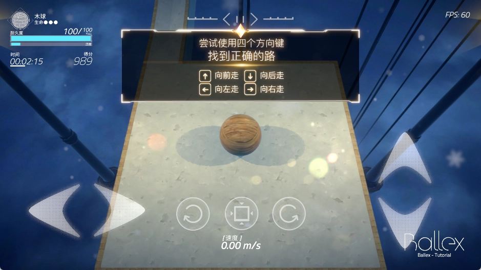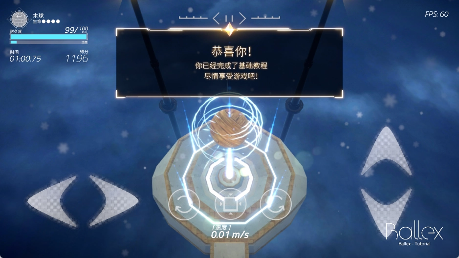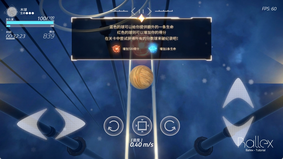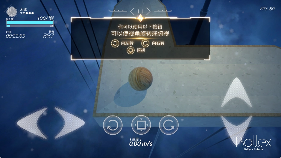 2、方向控制:利用屏幕下方方向按钮控制小球移动,使其在平台上滚动,要精准操作来躲避障碍,收集道具,到达终点。