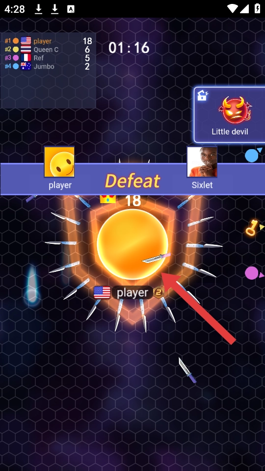 2、游戏中若被对手的飞刀击中,会触发Defeat提示,此时需重新调整策略,避免再次被击中,争取反败为胜。