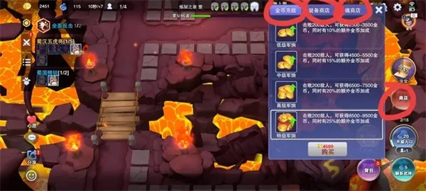 里面有金币充能,装备商店和魂商店三个不同商店。