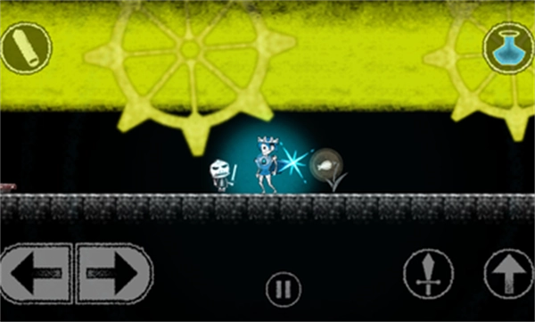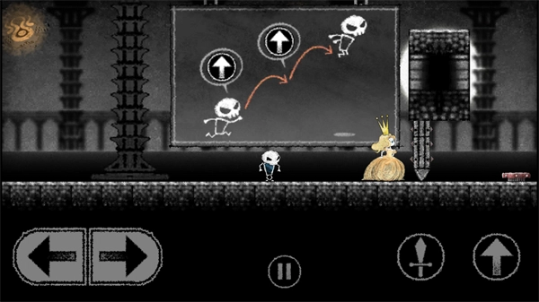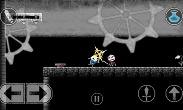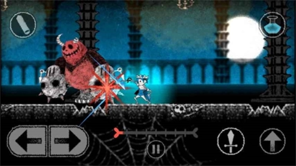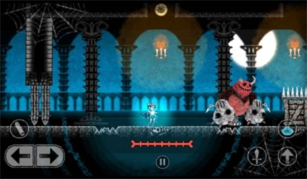 1、在本站完成安装后点击打开游戏,进入关卡后,左侧按键可操控小骷髅左右移动,右侧按键则用于控制攻击与跳跃。