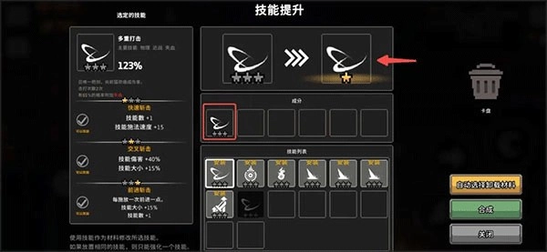玩到后期,得到的技能卡越来越多,一些用不上的技能卡可以通过‘+’进入技能升级强化界面,给需要升级的卡投喂‘狗粮’。