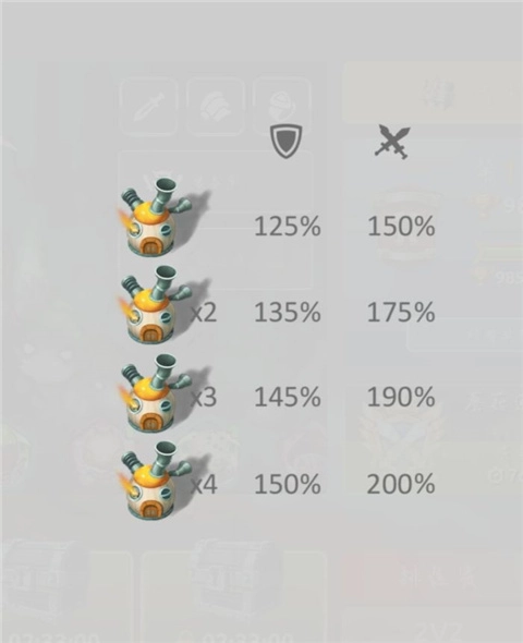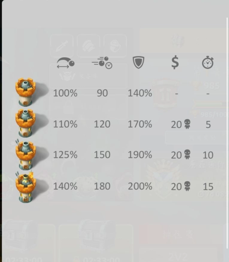 炮塔从1级升至2级时,射程增加10%,射速提升30,防御提高30%。