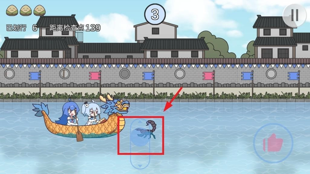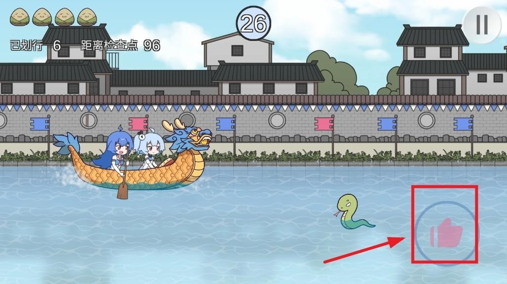 3、点击右下角点赞按钮,划动龙舟,收集粽子增加生命。