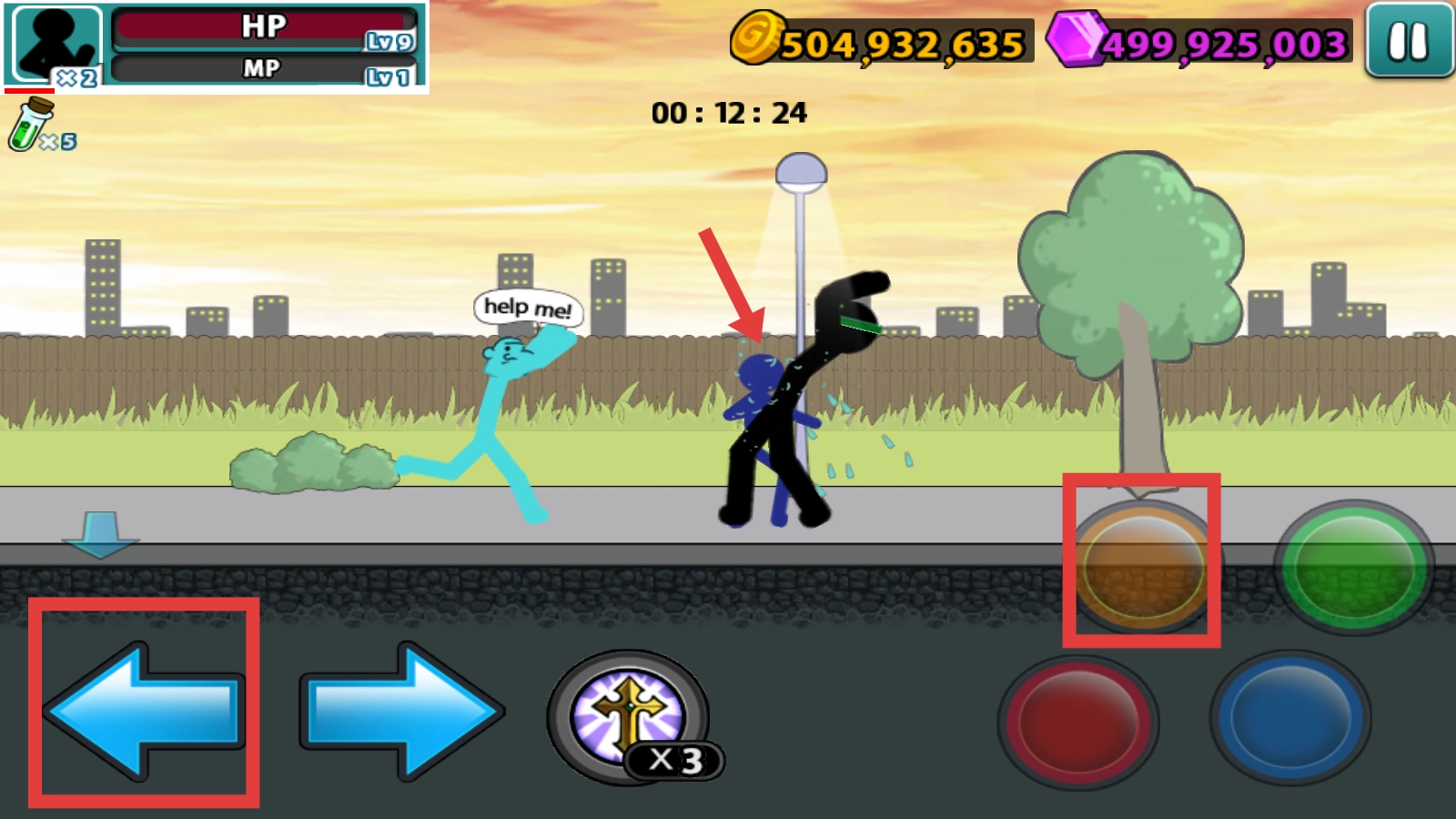 战斗时点击左箭头移动,配合【橙色按钮】发起攻击,能快速打倒敌人、解救求援者哦。