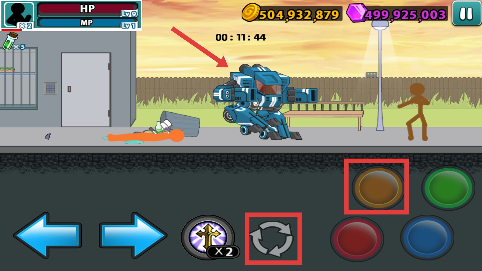 4、敌人太多时就点【转换按钮】,变身机器人,它的大范围攻击能快速清场,助你顺利通关啦。