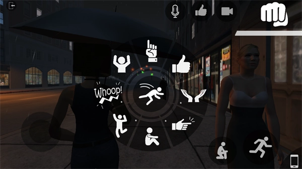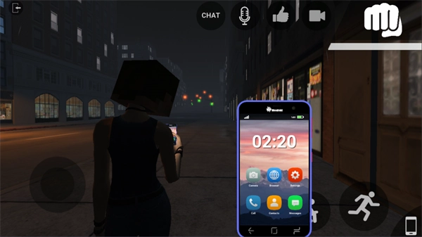 4、进入游戏里,可以先点击【chat】对话,左边的圆圈是前进或者后退,右边则是蹲下和跳跃,可点击右下角的【手机】图标,拍照或者是打电话都可以。