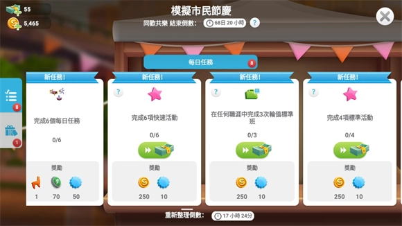 2、完成每日任务可以获得模拟币,点击右侧的模拟市民节庆按钮可以查看每日能完成的任务,完成后就可以获得模拟币和经验奖励。