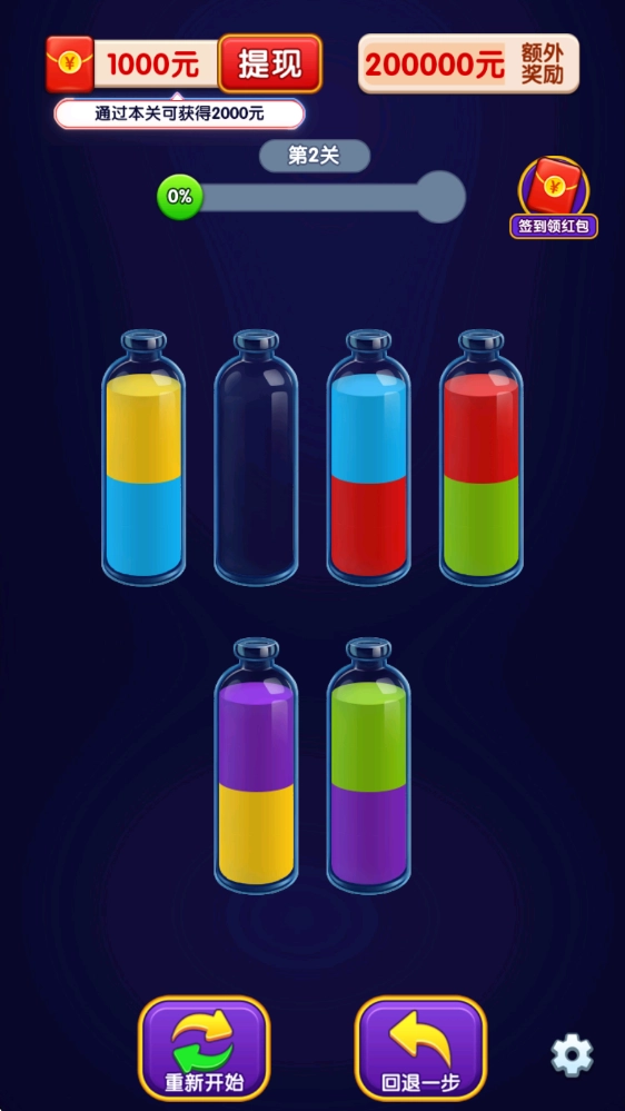 这是一款超适合锻炼脑力又能放松心情的趣味闯关游戏,操作起来毫无压力,只需点击水瓶就能转移里面的液体,把相同种类的液体都倒进同一个瓶子里,装满一瓶就算完成一部分任务。等所有瓶子都被对应液体装满,就能顺利通关,还能拿到丰厚的通关奖励呢!而且玩家通过的关卡数量越多,能领到的奖励就会越丰厚哦!