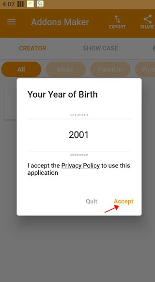 1. 在本站下载安装我的世界mod编辑器,安装完成后打开,在相关界面选择你的生日,随后点击接受按钮。