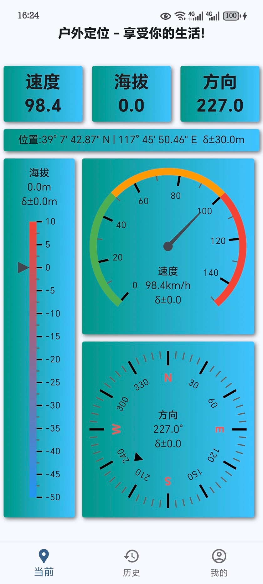 1、作为一款海拔测量工具,首先展示的自然是海拔高度,同时还有你所处的方向,以及当前行走速度。即便没有网络,这些数据也会被记录下来。