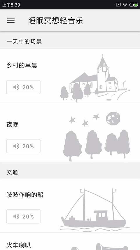 1. 开启睡眠冥想轻音乐,进入音乐库界面,音乐库内包含各类助眠声音(像早晨、夜晚、交通、原始噪音、水声等等),点击左上角的“三”字形标志。