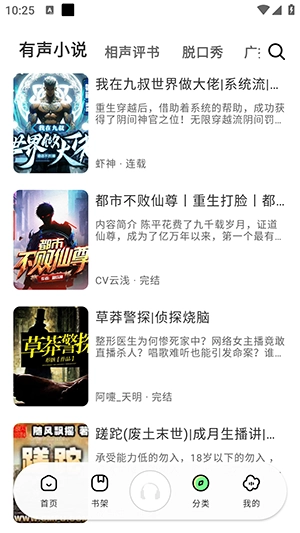 海量有声小说统统免费畅听,更新速度一骑绝尘,随时随地都能在线开启听书之旅,诚邀您来体验!
