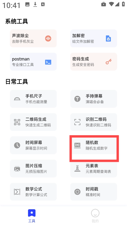 2、接着点击下方的“工具”,找到“随机数”功能。