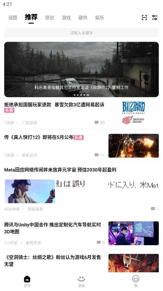 1、首页:首页涵盖话题、论坛、原创、游戏、硬件、娱乐等各类板块。玩家能够在自己钟爱的内容分类中浏览、评论,还能发布个人的游戏相关帖子。