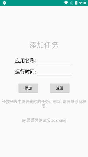 2、添加任务时输入应用名称,设置运行时间,如早上8点:08:00,下午5点就是17:00.