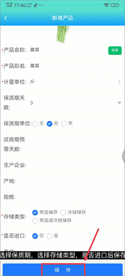 7、添加新产品时,需填写相关信息,如选择保质期、存储类型、是否进口等内容。全部填写完成后,点击保存按钮,该商品便录入完成。
