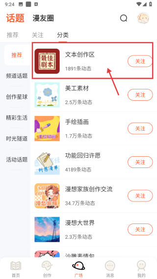 1、打开漫画创作类,点击底部广场选项,进入广场页面。