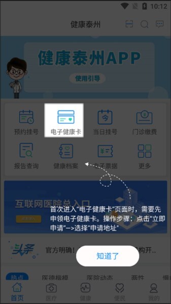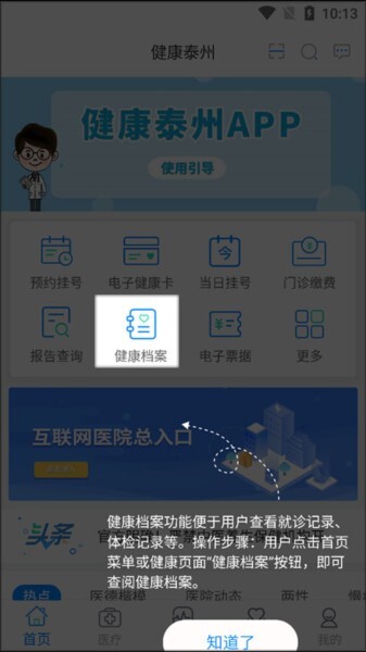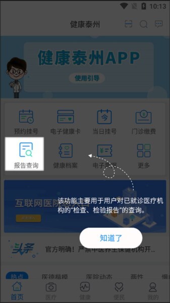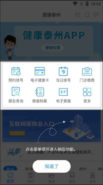 1、先把“健康泰州”安装好,打开软件后,点击对应的菜单项就能进入到相应的功能页面了。