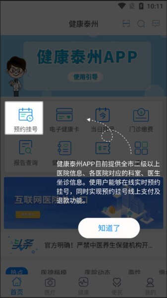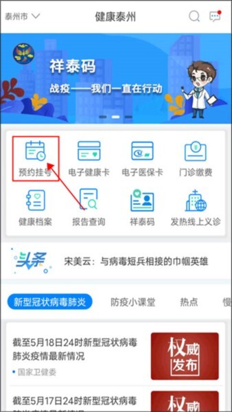 1、打开健康泰州点击预约挂号;
