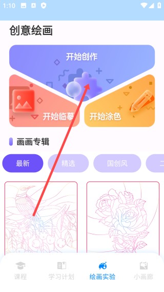 2、进入绘画实验页面以后,点击【开始创作】