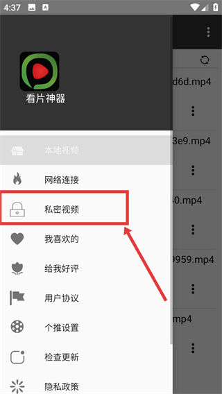 2、在展开的菜单中,点击【私密视频】选项,进入私密视频解锁页面。
