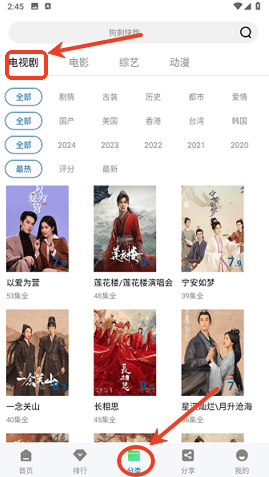 打开后,先点击首页底部的分类按钮,接着点击上方的电视剧选项,就能看到海量电视剧资源,直接点击你感兴趣的电视剧就能观看。另外,你也可以直接在搜索框输入想要观看的电视剧名称进行搜索观看。