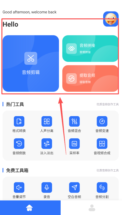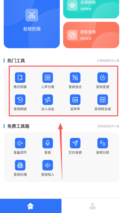 1、处理音频片段时,可以借助剪辑功能裁剪片段,也能通过拼接功能把多个音频连接在一起,这些工具在软件主页就能找到。