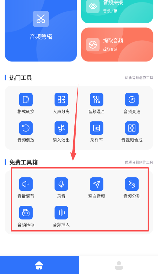 4、调整音频听感呢,用音量调节改变大小,用淡入淡出制造平滑过渡,在免费工具箱中即可使用。
