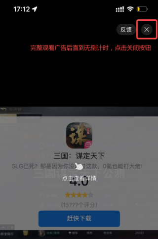 3、完整看完广告,点击关闭按钮即可免费加速
