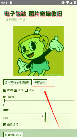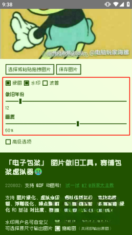 2、导入图片后,可借助下方的“绿图”“水印”“波普”等基本选项来添加各类细节。同时,通过拖动做旧的年份与画质设置,就能实现理想的做旧效果。