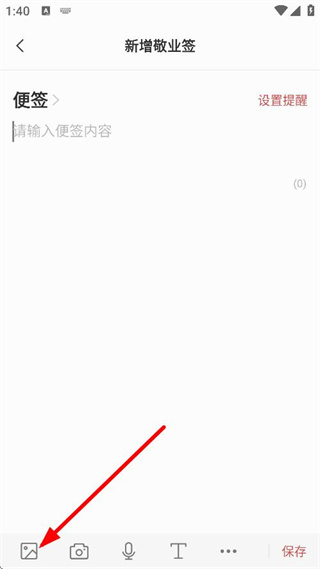 2、在新增敬业签页面,点击左下角图片图标,可添加图片到便签。