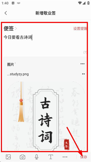 3、在敬业签页面,输入便签内容并添加图片后,点击保存,完成便签新增。