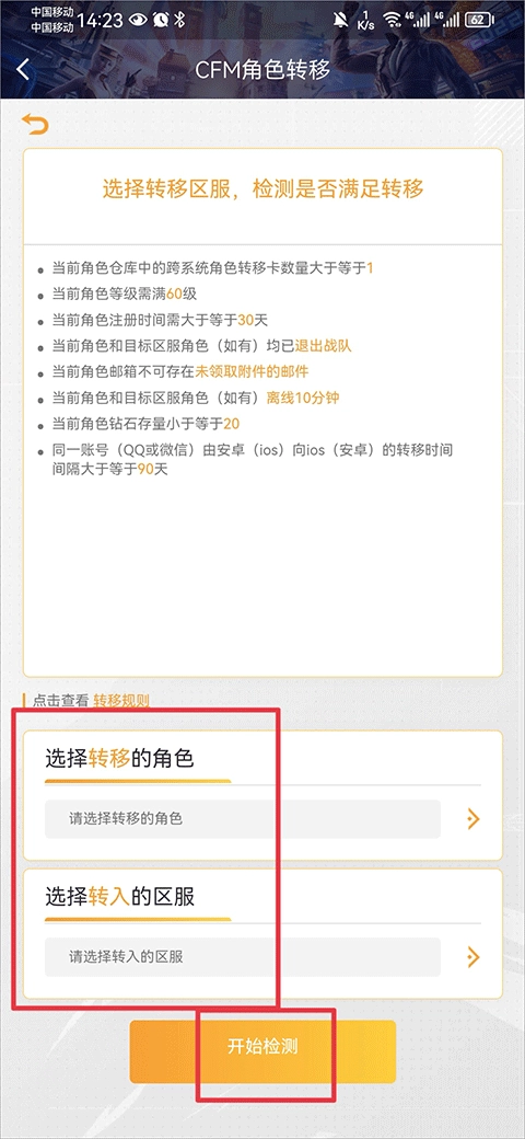 4、最后将转移的角色和转入的区服选择完成点击开始检测,满足转移角色要求后即可提交申请