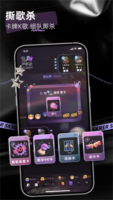 撕歌skr作为专业的手机音乐练歌平台,用户可以在手机上与大量用户在线比拼歌曲演唱。平台提供多种K歌互动模式,方便用户轻松参与歌曲挑战,还能在平台内演唱海量歌曲,这里的歌曲资源十分丰富,众多抖音热门歌曲也会第一时间在平台上线。